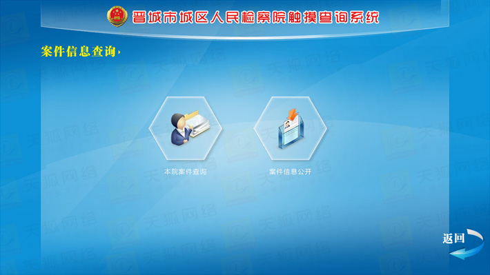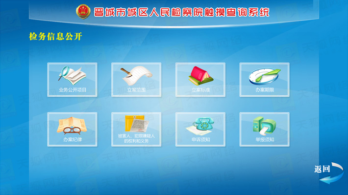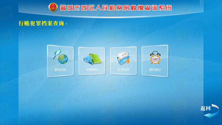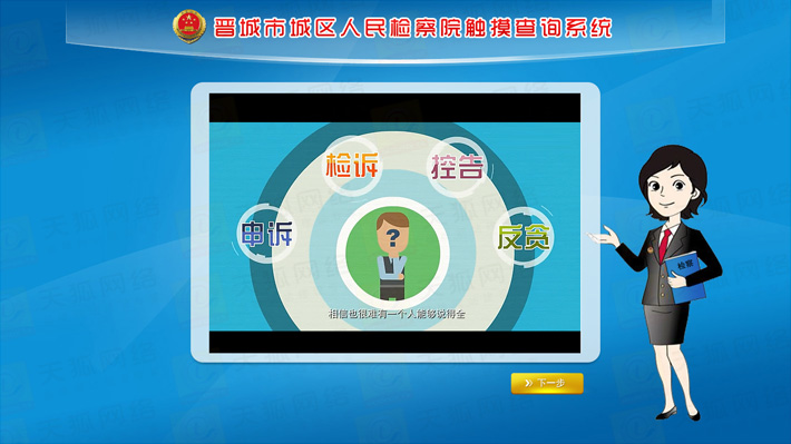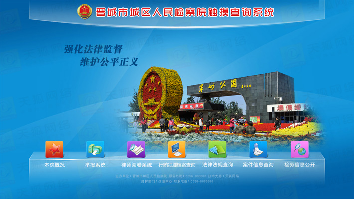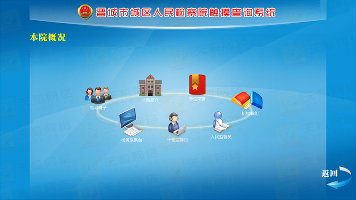 城區(qū)檢察院觸摸查詢系統(tǒng)分為前臺(tái)顯示模塊,動(dòng)畫效果展示模塊,后臺(tái)資料更新維護(hù)模塊,外部設(shè)備I/O模塊等五大部分。