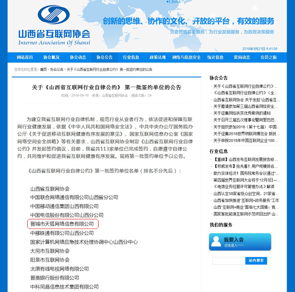 2018年9月14日,我公司正式成為第一批簽約《山西省互聯(lián)網(wǎng)行業(yè)自律公約》單位中的一員。