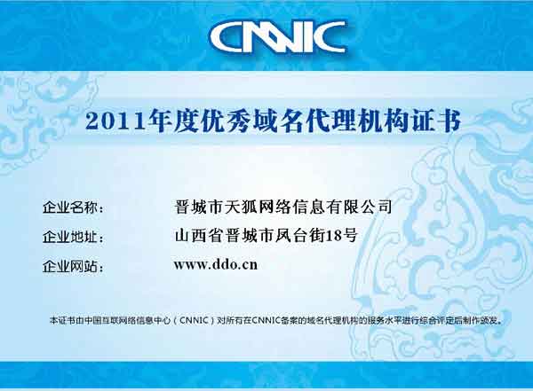 祝賀我公司獲得2011年度優(yōu)秀域名代理機構(gòu)證書